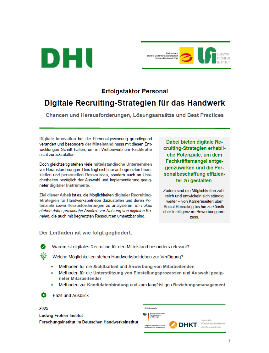 Das LFI hat den Leitfaden „Erfolgsfaktor Personal: Digitale Recruiting-Strategien für das Handwerk“ veröffentlicht. Er zeigt praxisnah, wie Handwerksbetriebe digitale Tools und Kanäle – von Social Media bis KI-gestützten Verfahren – gezielt für die Fachkräftegewinnung nutzen können. Mit Best-Practice-Beispielen, Bewertungsmatrix und Tipps zu effizienten Bewerbungsprozessen bietet der Leitfaden kompakte Unterstützung, um dem Fachkräftemangel im Handwerk aktiv zu begegnen.