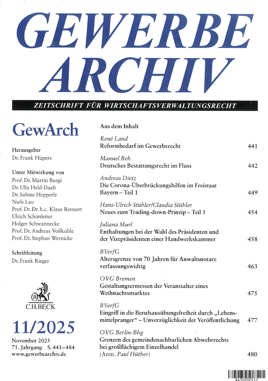 • Prof. Dr. Martin Burgi: Berufe an den Grenzen von Handwerk und Meisterpflicht: Vom dynamischen Handwerksbegriff zur Vermutungsregel